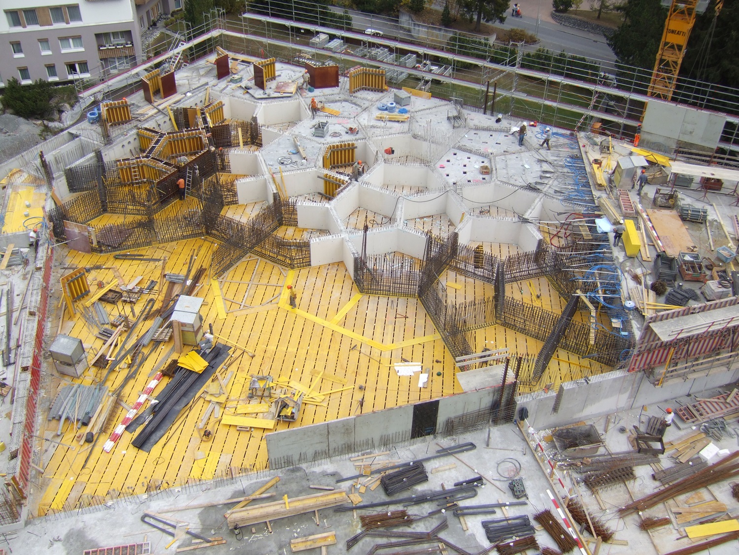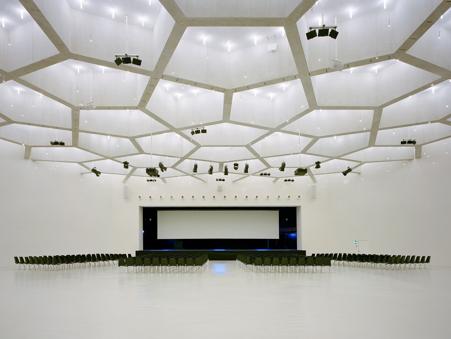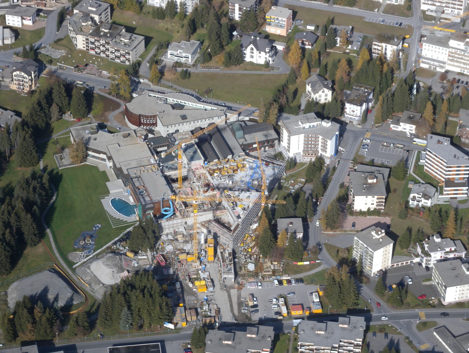 Der aus einem gewonnenen Wettbewerb hervorgegangene Auftrag beinhaltet die zweite Erweiterung des weltbekannten Kongresshauses. Bestand und Erweiterungsbau wurden so miteinander verbunden, dass ein stringentes Gesamtkonzept sowohl aus gestalterischer als auch aus nutzungstechnischer Sicht erzielt wurde. Für das Tragwerk bedeutete dies eine monolithische Anbindung an den Bestand, was eine sehr kostengünstige Erdbebenertüchtigung des bestehenden Gebäudes ermöglicht hat. Eigentlicher Knackpunkt des Projektes war die Überdeckung des grossen Plenarsaales für 2000 Personen, welcher als fünfeckige Wabendecke in Kombination mit dem selbstragenden darüber liegenden stark vorgespannten Geschoss gelöst wurde.