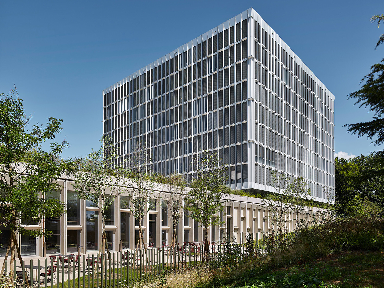 Der Erweiterungsbau des Hauptsitzes des Weltgesundheitsorganisation WHO in Genf nimmt Bezug auf das bekannte, 1966 vom Architekten Jean Tschumi entworfene Hauptgebäude. Auf drei Untergeschossen befindet sich die Verbindung zwischen dem bestehenden und dem neuen Verwaltungsgebäude. Dort finden sich zwei mehrgeschossige Säle mit unterschiedlichen, weit spannenden Deckenkonstruktionen. Das neue achtgeschossige Gebäude ist als monolithischer Baukörper aus Stahlbeton mit innenliegenden Kernen und auskragenden Decken konzipiert.