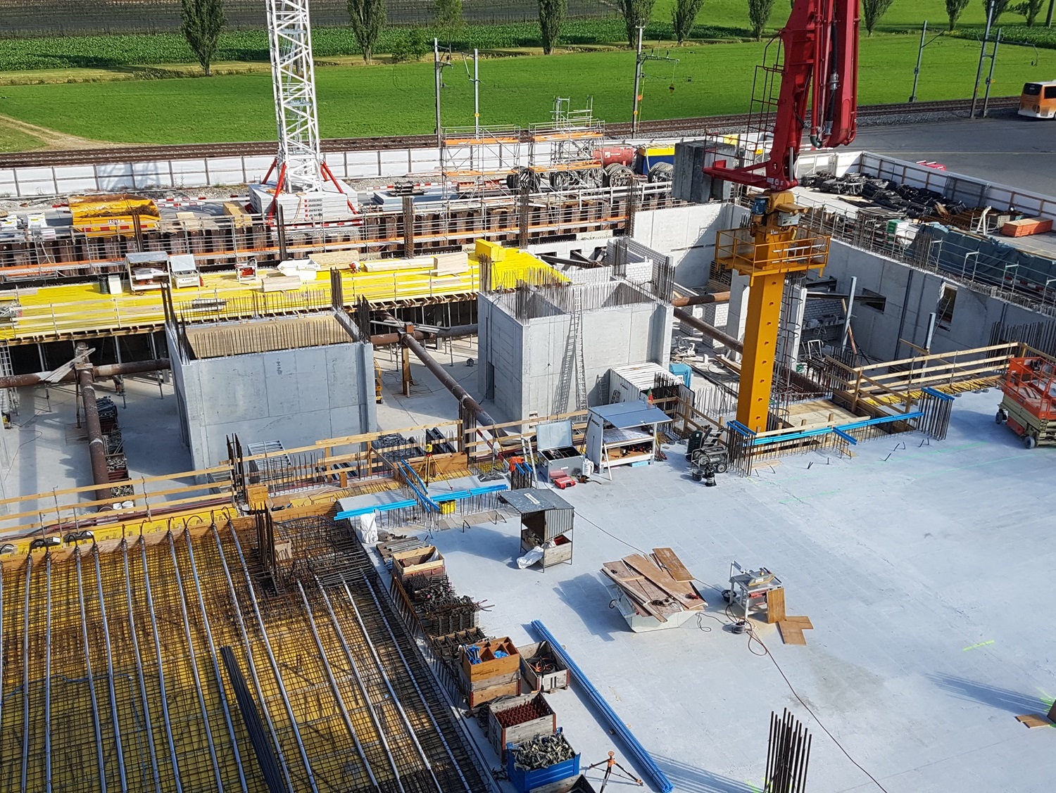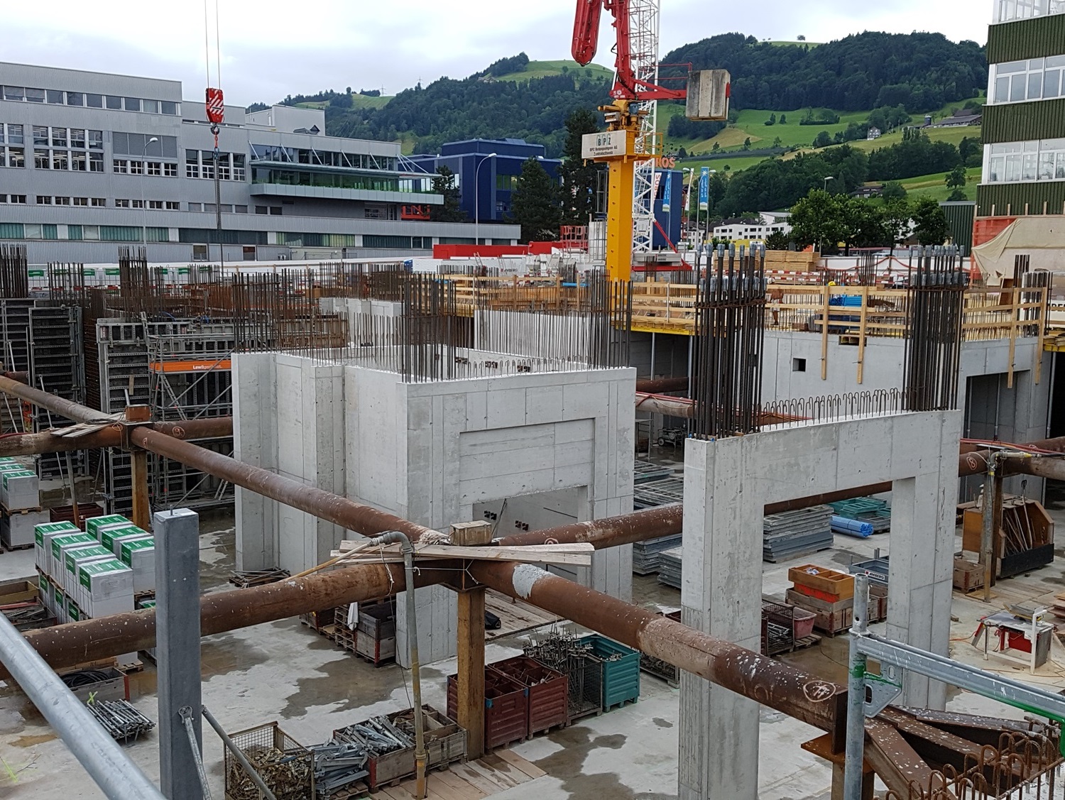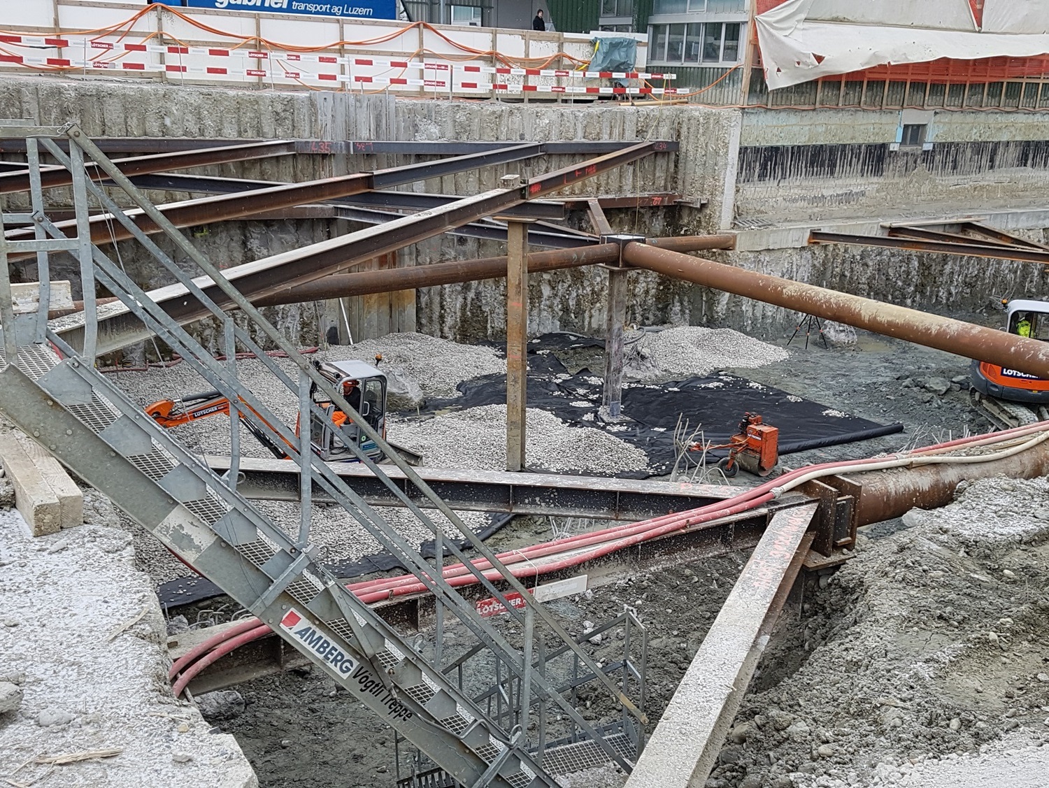 Die Einbindung des Untergeschosses ins Grundwasser sowie benachbarte, sensible Bauwerke machten eine Baugrube mit einer innenliegenden, die UG-Wände durchdringenden Aussteifung erforderlich.