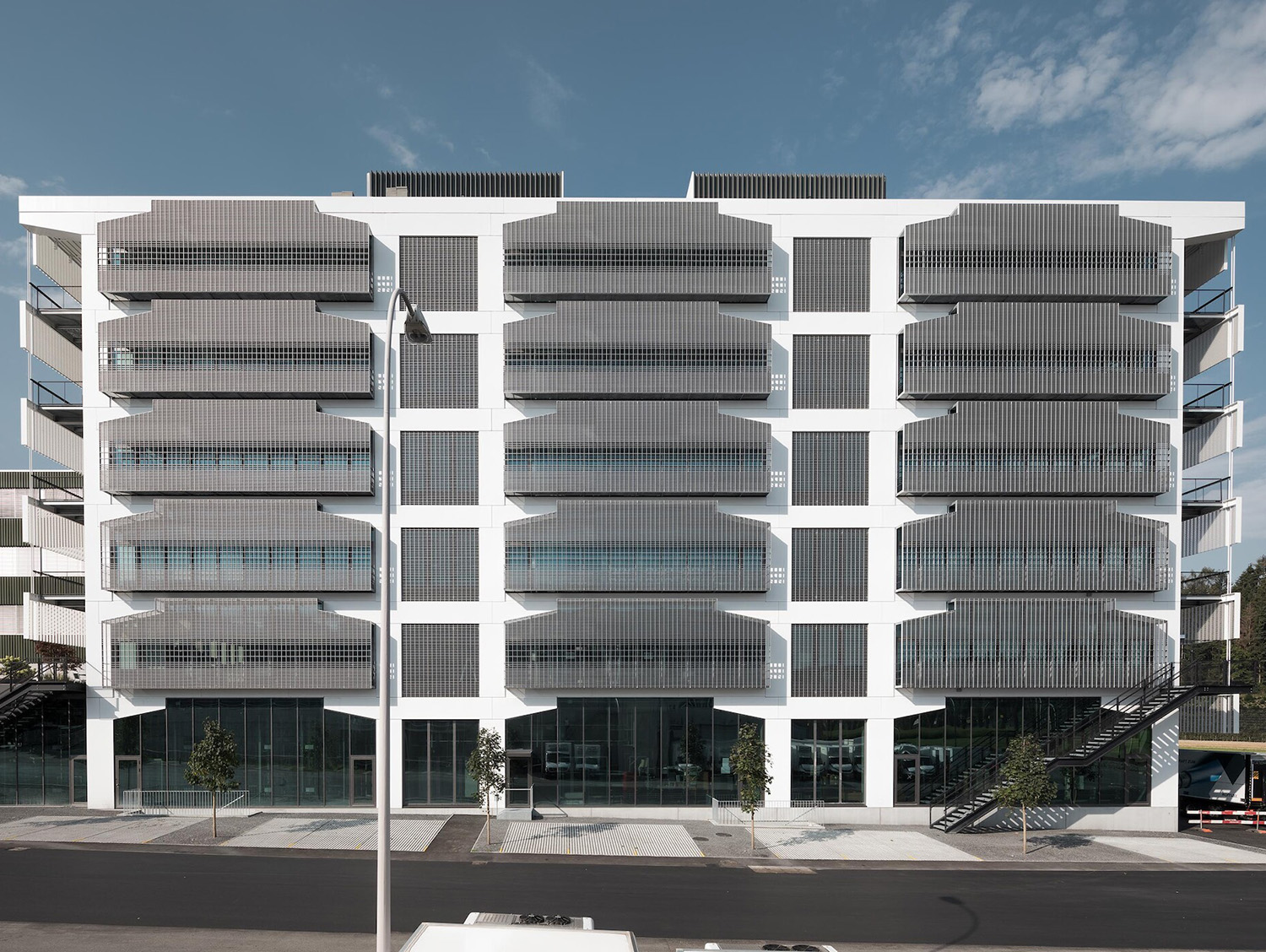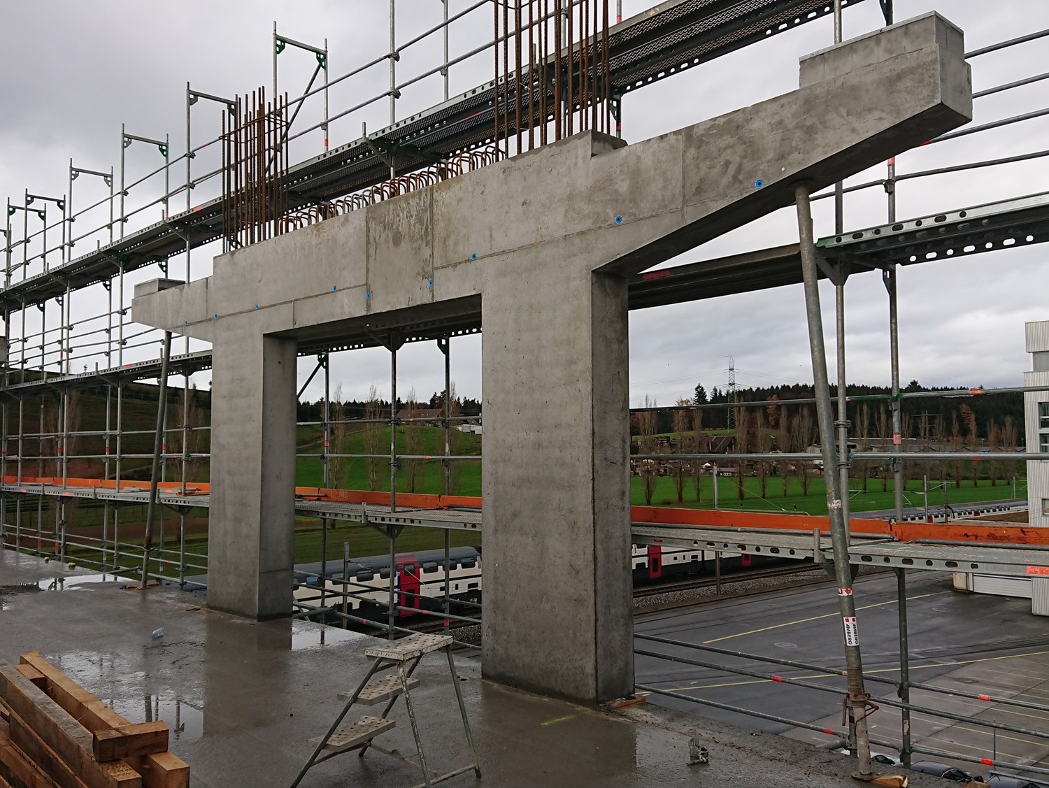 Den hohen Nutzlasten und grosse Spannweiten wird mittels konsolenartiger Tragelementen, vorgespannter Decken und spezieller Durchstanzmassnahmen Rechnung getragen. Die horizontale Aussteifung erfolgt über 6 Kerne.