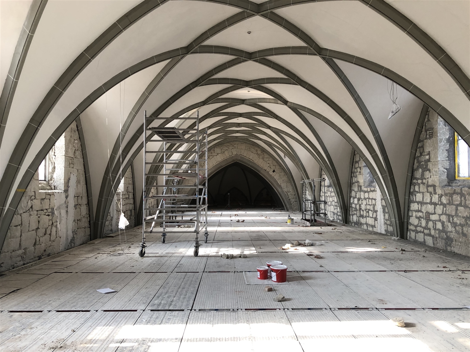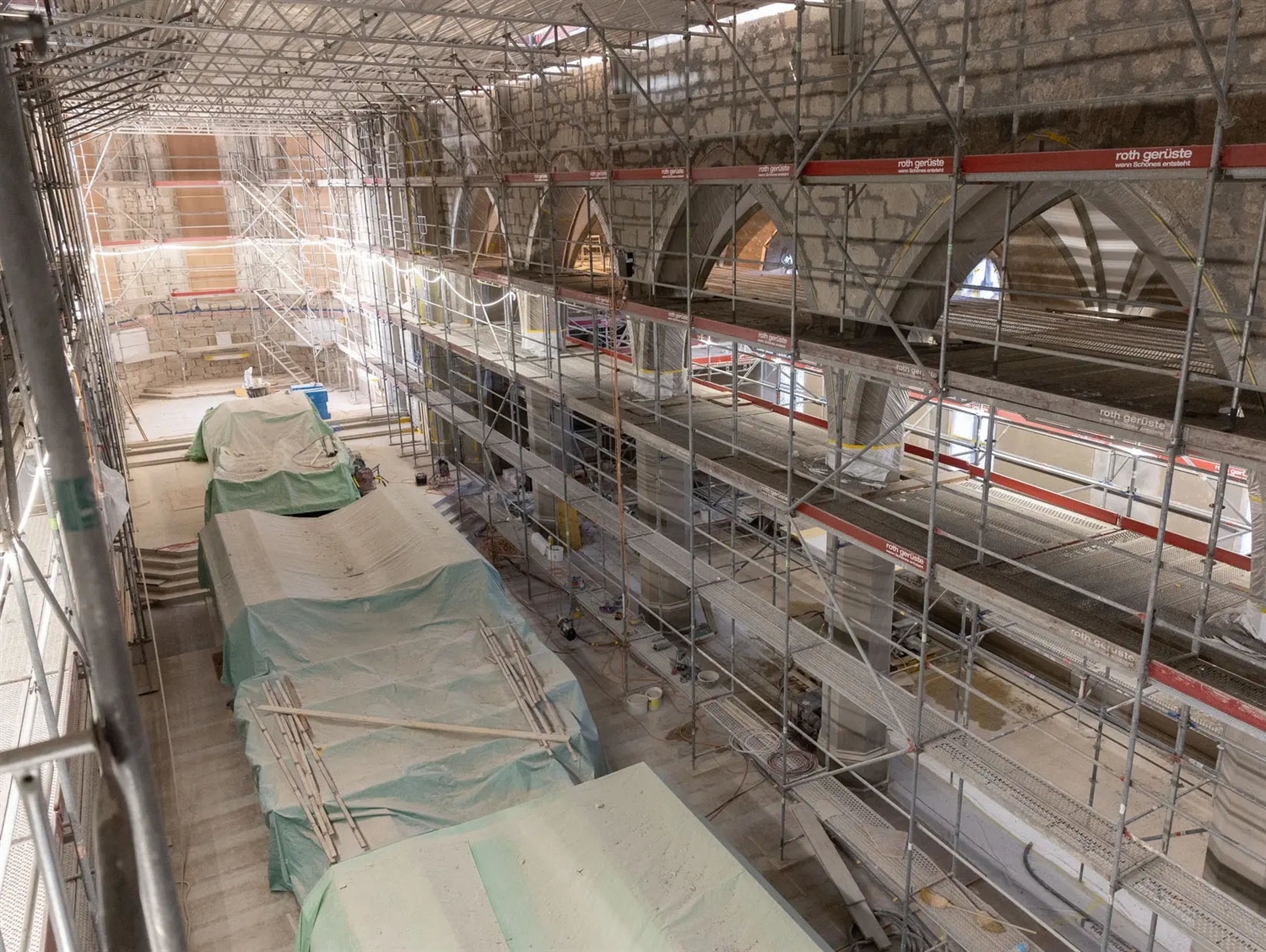 Der Verputzaufbau im Innenbereich wird komplett erneuert. Um wieder auftretende Risse zu minimieren, ist im neuen Putzaufbau eine Verstärkung der Rissbereiche vorgesehen. Dabei werden vor dem Entfernen des Putzes die Rissverläufe markiert, und nachdem der Putz entfernt ist, erfolgt das Aufbringen von Entkopplungsband und Netzeinbettung. Anschliessend wird der neue Grund- und Deckputz aufgetragen.